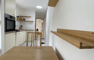 -Konyha (napfény csatorna világítás tetőablakról, beépített bútor, beépített gépészet: sütő, mosogatógép, mosógép, főzőlap, mosogató, fagyasztós mélyhűtő)
