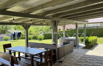 2 terasz, az udvarban 2 faház. A ház előtt fedett, 2 autós beálló és további 2 autó számára kialakított