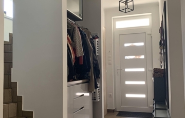 A külső falak 20 cm Austrotherm EPS80 hőszigetelést kaptak, melynek köszönhetően a ház tökéletes hangszigeteléssel rendelkezik, ezzel kizárva a főút zajának beszűrődését.