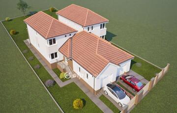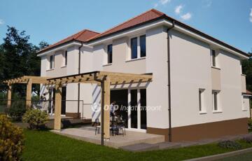A ház nappali + 4 szobás, saját 480 m2-es telekrésszel és garázzsal, ideális választás többgyermekes családnak vagy azoknak, akik szeretik a kényelmes, jól átgondolt tereket.