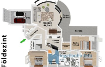 Az ingatlan a fölszinten előtérből, nappaliból, teraszból, konyhából, két fürdőszobából, egy mosókonyhából és 3 szobából áll. A garázsba közvetlenül az előtérből tudunk átmenni.