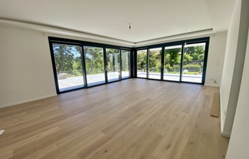 The 75 m² living room, dining area and kitchen create an elegant open space with direct access to the 105 m² partly covered panoramic terrace.