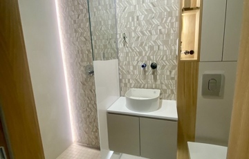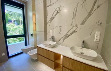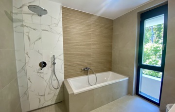 A szülői lakrész teljesen szeparált, elegáns, nagy méretű fürdőszobával és gardróbbal.