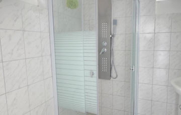 A fürdőszoba külön említést érdemel: ízlésesen kialakított, modern megoldásokkal felszerelt, ahol a minőségi burkolatok, a harmonikus színvilág és a praktikus elrendezés együttesen teremtenek elegáns, mégis otthonos hangulatot.