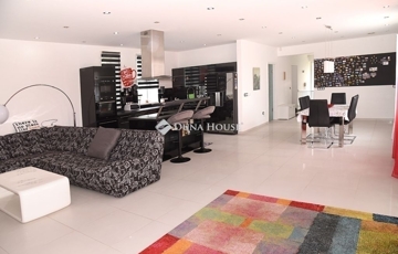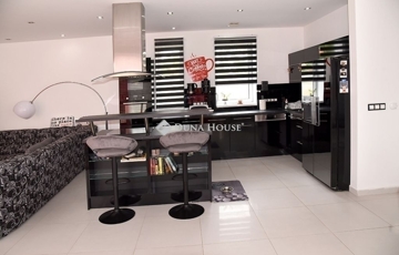 A belső terek elegáns, magas minőségű burkolatokkal és beépített bútorokkal rendelkeznek, amelyek a vételár részét képezik. Mindezek mellett egy 38 m²-es, kétállásos garázs is tartozik a házhoz, közvetlen átjárással a lakórészbe.