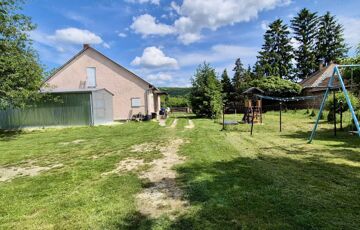 A három beállós garázzsal és tárolóval rendelkező ingatlan 2247 m²-es, sík, teljesen körbekerített teleken áll, ahol gyümölcsfák (dió, cseresznye, őszibarack, vilmoskörte, meggy), fenyők és díszcserjék biztosítják a természet közeli hangulatot. A kertben kiépített kis játszótér gondoskodik arról, hogy a legkisebbek is biztonságosan játszhassanak a friss levegőn.
