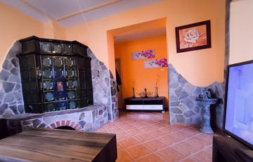 A fűtést vízpatkós cserépkályha biztosítja, cirkós kivitelezéssel, a padlóban lefektetett csöveken áramoltatva a vizet a radiátorokhoz.