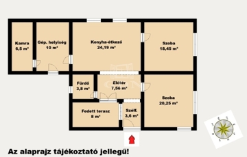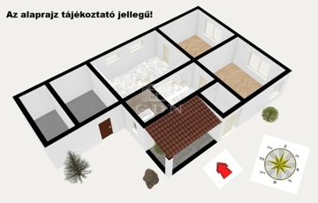 Belső elrendezés: három szoba, melyek közül kettő egymásból és külön-külön is nyílik. Kialakításra került egy AMERIKAI KONYHÁS nappali élettér. A fürdőszoba ABLAKOS, a toalettel egy légtérben. Az ingatlan BEFEJEZÉSRE VÁR, így TESTRE SZABHATÓ befejezést és belső kialakítást tesz lehetővé.