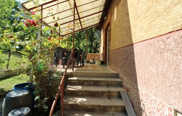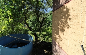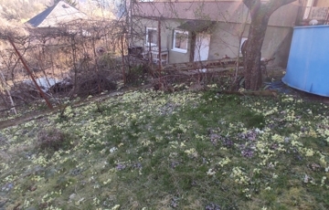 A kert sík, élhető kialakítású, szőlő lugassal, gyümölcsfákkal, vidám kis virágokkal. Telekméret: 855 nm.