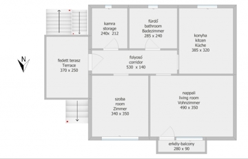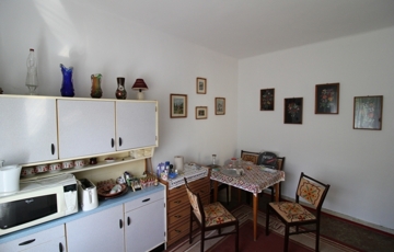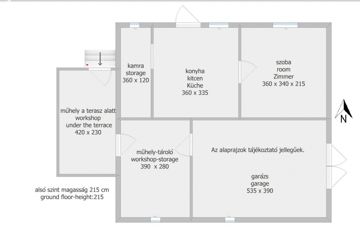 A felső lakószinten 2 szoba, nagy konyha-étkező, erkély, fürdő és előszoba, spájz található. Lenn pince, terasz, garázs, műhely.
