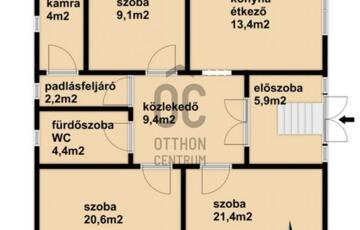 - 90,4m2 lakótér helyiségei: 3 szoba, tároló, közlekedő, konyha-étkező, kamra, fürdőszoba wc-vel