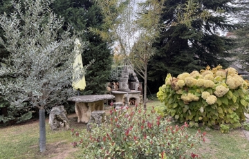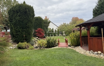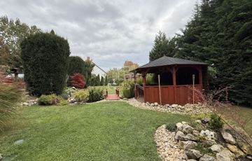 A kovácsoltvas kapun át juthatunk a gyönyörűen parkosított kertbe, ahol a garázs mellett több autó számára térkövezett beálló is rendelkezésre áll.