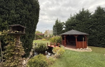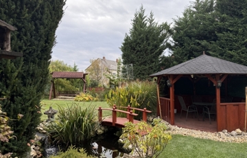 A kert öntözőrendszerrel ellátott, benne dísznövények, kis kerti tó és sütögető teszik hangulatossá a környezetet.