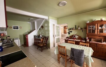 Az első házban található két hálószoba + egy tetőtéri szoba, nappali, konyha-étkező, spájz, két fürdőszoba, tároló.