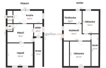 Földszint: nappali (19,9 nm), étkező (16,3 nm), konyha (12,8 nm), kamra (2,3 nm),