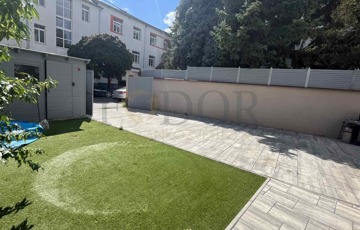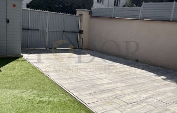 A 440 m²-es saroktelek két utcáról is megközelíthető, parkosított, műfűvel és Viacolor térkővel burkolt, tágas kocsibeállóval, amely két autó számára biztosít kényelmes parkolást.