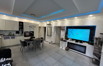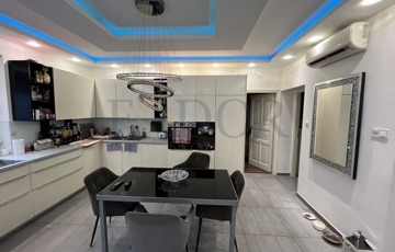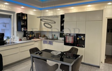 A modern, gépesített konyha beépített berendezésekkel felszerelt. A helyiségek burkolata járólap és laminált padló, a nappali és az egyik hálószoba klimatizált.