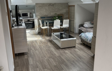 Világos, tágas lakrész amerikai konyhás nappalival, két hálószobával és kádas fürdőszobával.