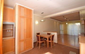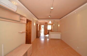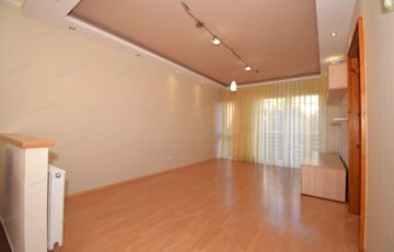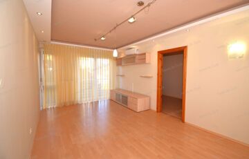 Elosztása: előszoba, konyha étkezővel, nappali, fürdőszoba zuhanyzóval, káddal és WC-vel és két hálószoba.  Az egyik hálószobában és az előszobában is nagy beépített szekrények segítik a tárolást. A lakás vételár része a fotókon látható nappali bútor és komód. Nappali fölött álmennyezet látható beépített spotlámpákkal.