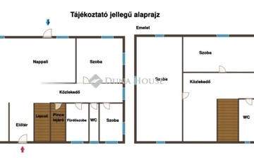 Földszint: 60 m²-es amerikai konyhás nappali, két hálószoba, zuhanyzós fürdőszoba és külön WC; közvetlen kapcsolat a pincével