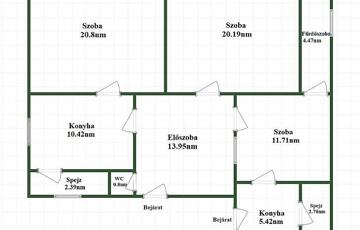 Az ingatlan praktikus és jól átgondolt elrendezésű: egy tágas, világos előszobából három külön bejáratú szoba, egy kényelmes méretű konyha kamrával, valamint egy fürdőszoba nyílik, ahol a WC egyben és külön helyiségben is megtalálható. A házban egy második konyha is kialakításra került szintén kamrával, amely igény szerint könnyedén további szobává alakítható, így a lakótér rugalmasan formálható a leendő tulajdonos igényeihez.