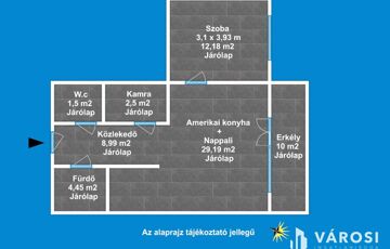 A lakás 1 db amerikai konyhás nappalival, 1 db hálószobával, 1 db fürdőszobával, külön Wc-vel, közlekedővel, erkéllyel rendelkezik.