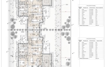 Mindkét ingatlanhoz tartotik egy 490 nm-es füvesített terület fatelepítésekkel, az ingatlanok nyitott teraszai beton térkő burkolatot kaptak, a külső falak fehér és szürke színű nemesvakolaúak valamint 0,50 m széles kavicsszegély szépíti az épületet körvonalát.
