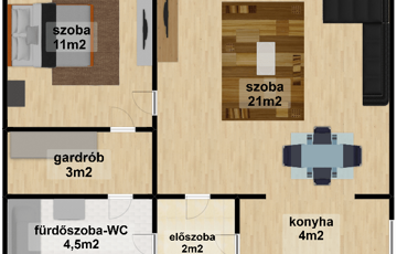 Továbbhaladva az előszoba végéből, nyílik a 22m2-es nappali, amely lehetőséget add, baráti családi összejövetelek megtartására. A hálószobából léphetünk egy praktikus gardróbba, ami a fürdőszoba és a hálószoba között kapott helyett.