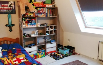 A lakás egy liftes társasház 5. szintjén található. Az ingatlan kétszintes: alsó szinten található a gépesített amerikai konyhás nappali,