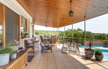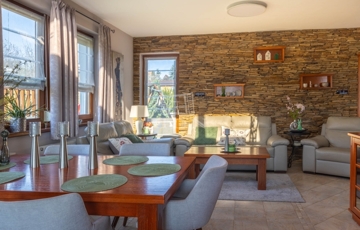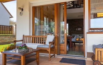 Az étkezőből közvetlen kijárat nyílik a teraszra, és a legtöbb helyiség teraszkapcsolattal rendelkezik.