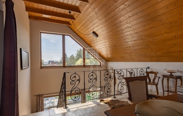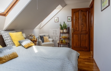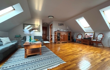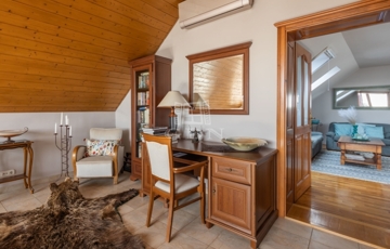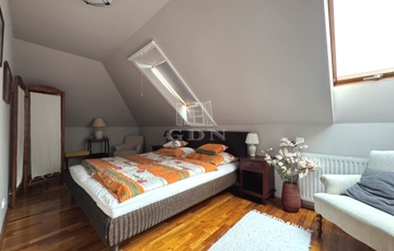 A tetőtérben egy tágas nappali, két hálószoba, gardrób és fürdőszoba kapott helyet. A szinthez kapcsolódik egy részben zárt, 22 m²-es panorámás erkély, ahonnan lenyűgöző kilátás nyílik a környező tájra és a Velencei-tó irányába.