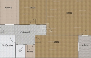 Az ingatlan a társasház első emeletén helyezkedik el, 2+1 félszobás kialakítású, melyen kívül előszoba, konyha, kamra, fürdő, külön WC és a parkra néző erkély áll rendelkezésre.