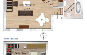 Az amerikai konyhás nappali tágas és világos, a két ablakos fürdőszoba természetes szellőzésű, az emeleti háló pedig beépített szekrénnyel és rejtett tárolóval felszerelt.