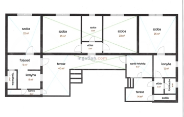- jelenlegi elosztás: 6 szoba, 2 konyha, 2 fürdőszoba, kamra.