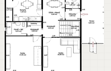 A z ingatlant beépített, üvegezett teraszon keresztül jutunk a földszinti lakótérbe, melynek nettó alapterülete 68,42 m².