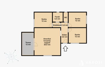 •	Amerikai konyhás nappali, 3 db. hálószoba, fürdőszoba, wc.