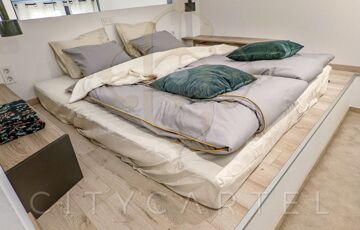 A nagy belmagasságnak köszönhetően a konyha felett kialakított galérián kényelmes hálószoba kapott helyet.