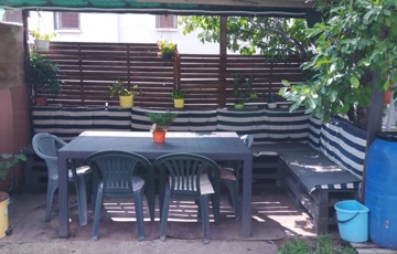 A házhoz egy tágas, rendezett udvar tartozik, ahol a gyerekek is biztonságosan játszhatnak. A pihenést és a baráti beszélgetéseket egy hangulatos, raklapbútorral berendezett kerti kiülő szolgálja. Az udvar hátsó részében pedig lehetőség nyílik egy szalonnasütő vagy grillhely kialakítására, ami tökéletes helyszín a szabadtéri sütögetésekhez és családi összejövetelekhez.