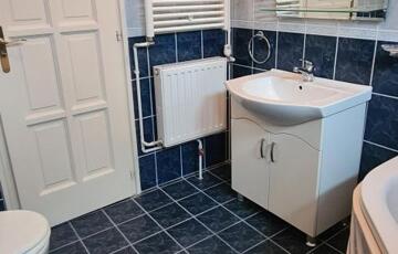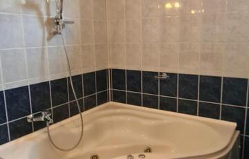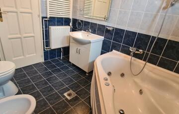 A fürdőszoba tágas, sarokkádas, 2 ablakon keresztül is érkezik be fény, törölközőszárító radiátorral és bidével is felszerelt.