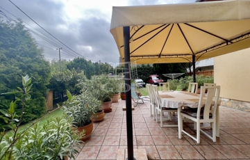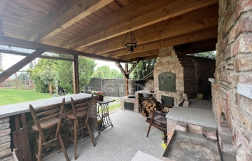 A kert gondozott, fedett kiülővel és kerti sütőhellyel, ideális helyszín a nyári estékhez. A házhoz tartozik terasz, garázs, valamint több autó számára parkolóhely az udvarban.