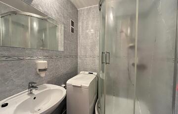 A fürdőszoba új burkolatot kapott, zuhanykabinos. A mosógép be-és kiállása is ebben a helyiségben lett kialakítva.