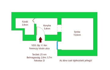 Eladó Budapest V. ker. Ferenczy István utcában - az Astoria és a Károlyi kert közelében - rendezett, lift nélküli ház földszintjén egy 25 nm-es, 1 szobás, udvarra néző lakás, beépített bútorokkal. Fürdője zuhanyzós , WC-vel.