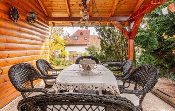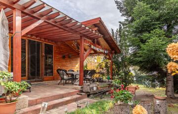 A gondozott kertben hatalmas fedett terasz, valamint szalonnasütő-bográcsozó teszi lehetővé a családi és baráti összejöveteleket. A garázs egy autó számára biztosít helyet, a beállón további két gépkocsi parkolhat.