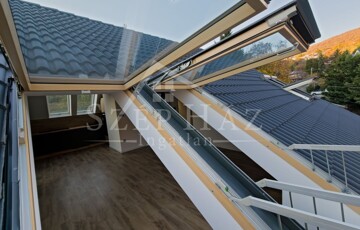 A tágas, amerikai konyhás nappali különlegessége a teljesen kinyitható tetőtéri ablakok, melyek kis erkélyként is használhatók, így közvetlen kapcsolatot teremt a természetes környezettel.