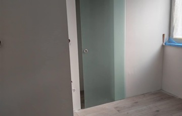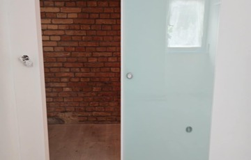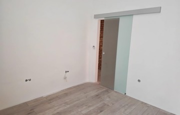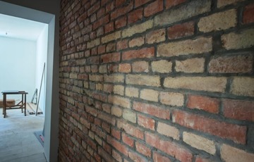 Különlegessége a folyosó teljes fala briliánsan kilátszó téglás, ami egyedi karaktert kölcsönöz a lakásnak.