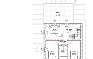 Az emeleten 3 hálószoba, fürdő, háztartási helyiség és egy 31,92 m²-es terasz kapott helyet.