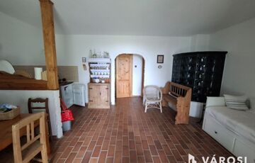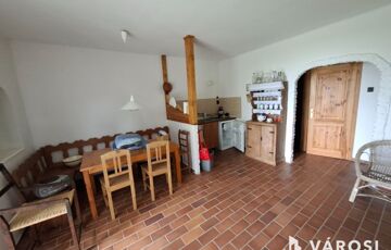 Az alsó részen fedett kocsibeálló, kerti sütő és pihenőterasz található; az épületben amerikai konyhás nappali, fürdőszoba és két félszoba van, cserépkályhával fűtve.