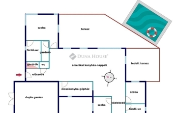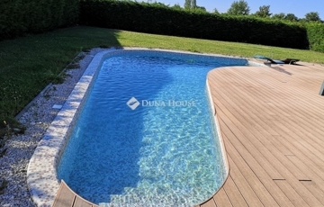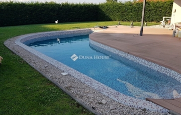 A telek rendezett, kerítéssel körbehatárolt, és tartalmaz egy 47 m³-es medencét napozó területtel, ahol a család és barátok kellemesen pihenhetnek. Az ingatlanhoz elektromos úszókapu biztosít kényelmes bejárást.