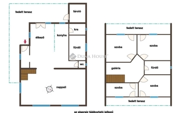- Garázs: 28,8 m² + felette 23 m² szoba