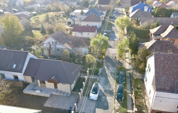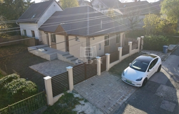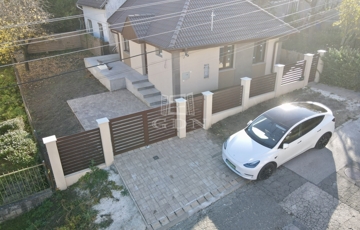A térkövezett járda és autóbeálló, elektromos kapu, valamint a modern, letisztult kerítés tovább emeli a ház kényelmét és esztétikáját.